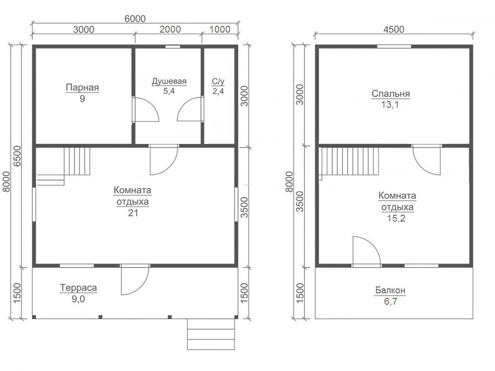 Сруб с мансардой: 1-ый этаж- 2,3 м. (17 венцов) 2-ой этаж (мансарда)- 2,3 м. Сруб в полтора и два этажа: 1-ый этаж 2,3 м. (17 венцов) 2-ой этаж 2,3 м. каркасные аттиковые стены (боковые) высотой 1,5 м. в полутораэтажной бане. 2,3 м. (поднят брусом на 17 венцов) в двухэтажной бане. |